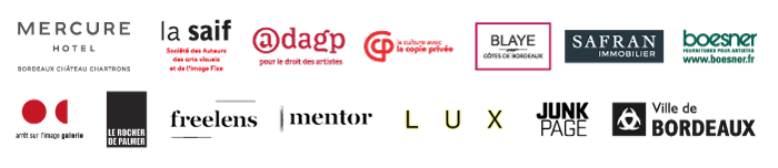 Mairie de Bordeaux, Hôtel Mercure Bordeaux Chartrons, Blaye Côtes de Bordeaux, la SAIF, l'ADAGP, la Copie privée, SAFRAN Immobilier, Bœsner, Arrêt sur l’Image Galerie, LE ROCHER DE PALMER, FREELENS PRIX MENTOR, le réseau LUX, JunkPage.